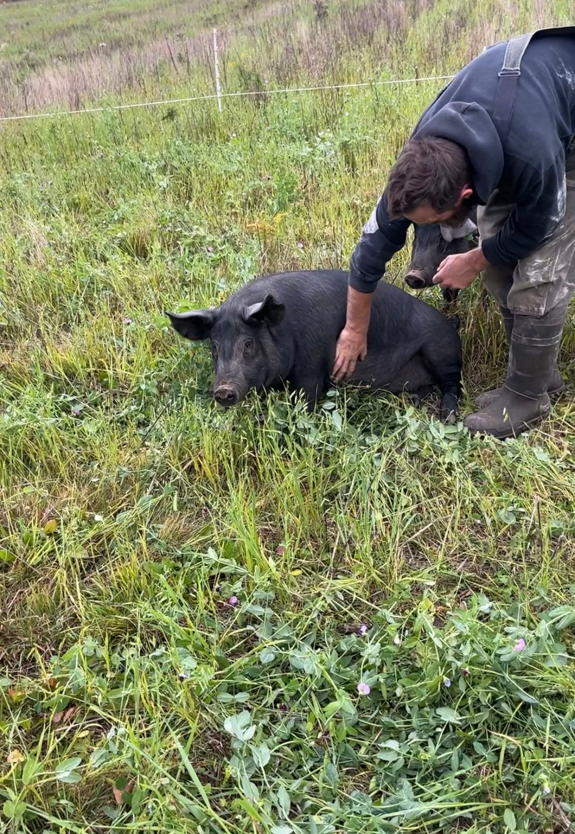 Our pigs live outside on pasture, where they can root and wallow to their heart’s content. They’re raised on grass and fed a healthy grain mix for balanced nutrition, they are a mix between Large Black, Berkshire and Tamworth breeds.